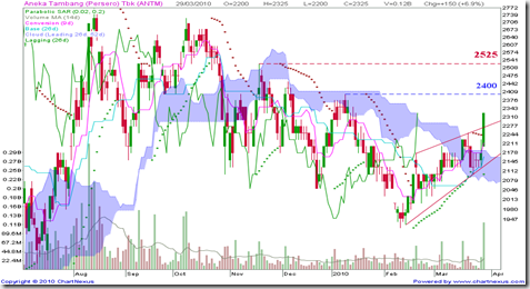 | Tanggal : 29/03/10 Yang didukung oleh Psar sudah berpindah di bagian bawah candle dan garis bantu yang membentuk pola Ascending Triangle dengan candle menerobos garis atasnya Tapi kunci terpenting adalah candle terakhir dan volume terakhir memastikan potensi UP ini Kesimpulannya